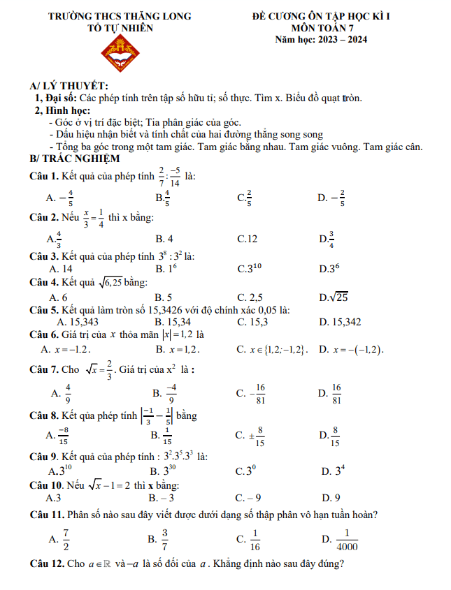 Đề Cương Ôn Tập Toán 7 Đề cương học kì 1 Toán 7 năm 2023 – 2024 trường THCS Thăng Long – Hà Nội 09/12/2023