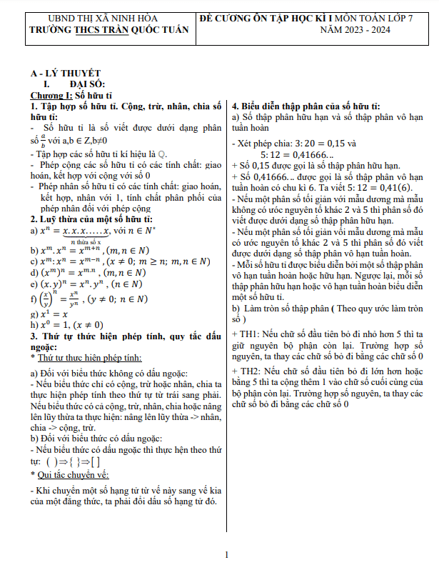 Đề Cương Ôn Tập Toán 7 Đề cương học kì 1 Toán 7 năm 2023 – 2024 trường THCS Trần Quốc Tuấn – Khánh Hòa 12/12/2023