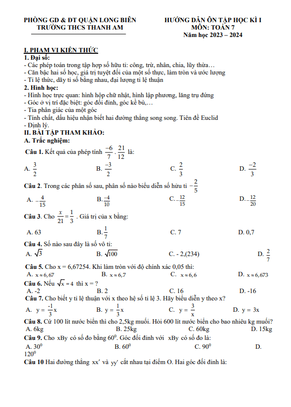 Đề Cương Ôn Tập Toán 7 Ôn tập cuối kì 1 Toán 7 năm 2023 – 2024 trường THCS Thanh Am – Hà Nội 09/12/2023