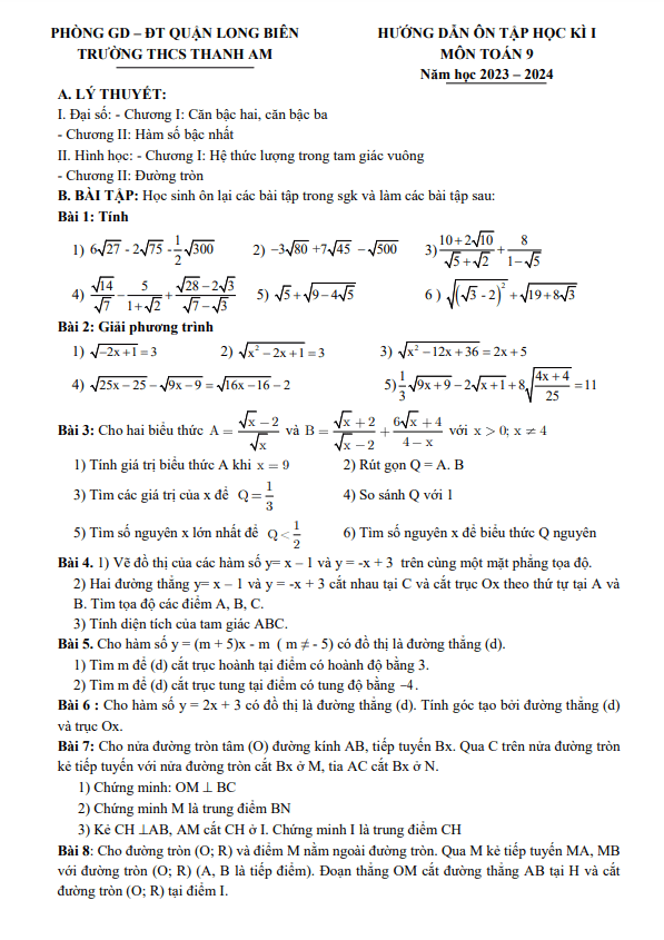 Đề Cương Ôn Tập Toán 9 Ôn tập cuối kì 1 Toán 9 năm 2023 – 2024 trường THCS Thanh Am – Hà Nội 09/12/2023