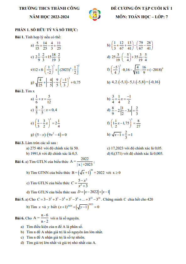 Đề Cương Ôn Tập Toán 7 Ôn tập cuối kỳ 1 Toán 7 năm 2023 – 2024 trường THCS Thành Công – Hà Nội 09/12/2023