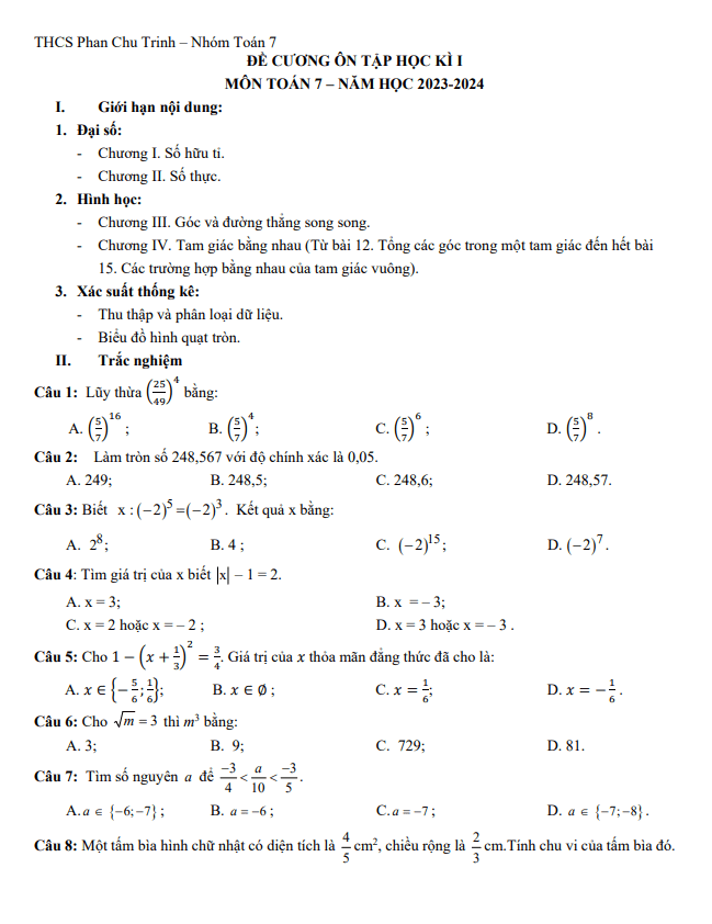 Đề Cương Ôn Tập Toán 7 Đề cương Toán 7 học kì 1 năm 2023 – 2024 trường THCS Phan Chu Trinh – Hà Nội 07/12/2023