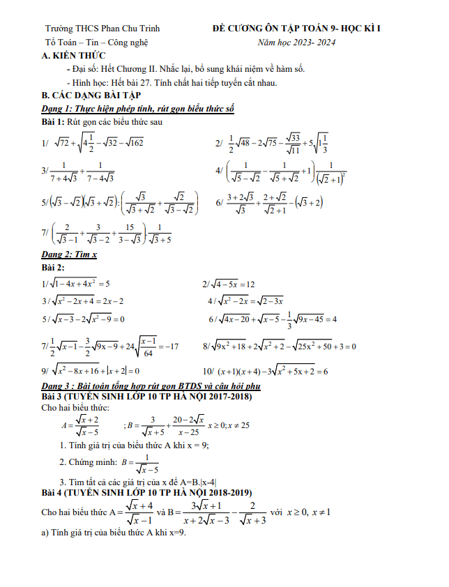 Đề Cương Ôn Tập Toán 9 Đề cương Toán 9 học kì 1 năm 2023 – 2024 trường THCS Phan Chu Trinh – Hà Nội 07/12/2023