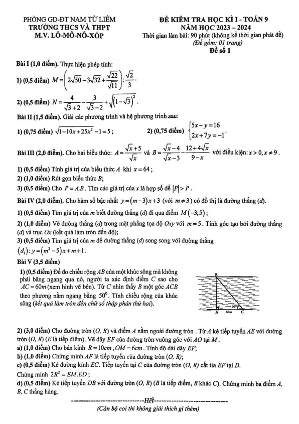 Khảo Sát Chất Lượng Toán 9 Đề khảo sát Toán 9 tháng 11 năm 2023 – 2024 trường THCS Trưng Vương – Hà Nội 02/12/2023