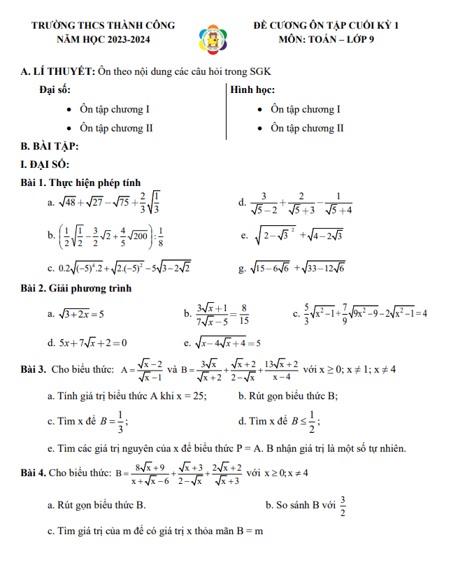 Đề Cương Ôn Tập Toán 9 Ôn tập cuối kỳ 1 Toán 9 năm 2023 – 2024 trường THCS Thành Công – Hà Nội 09/12/2023