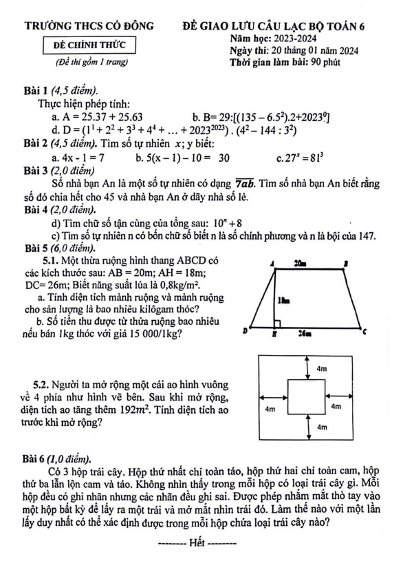 Đề Thi HSG Toán 9 Đề học sinh giỏi Toán 9 năm 2023 – 2024 phòng GD&ĐT TP Cao Lãnh – Đồng Tháp 20/01/2024