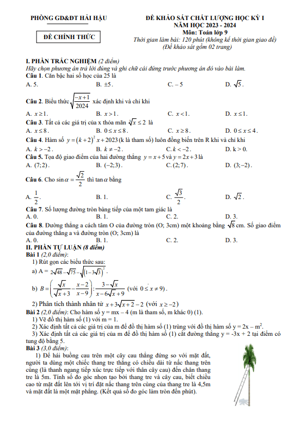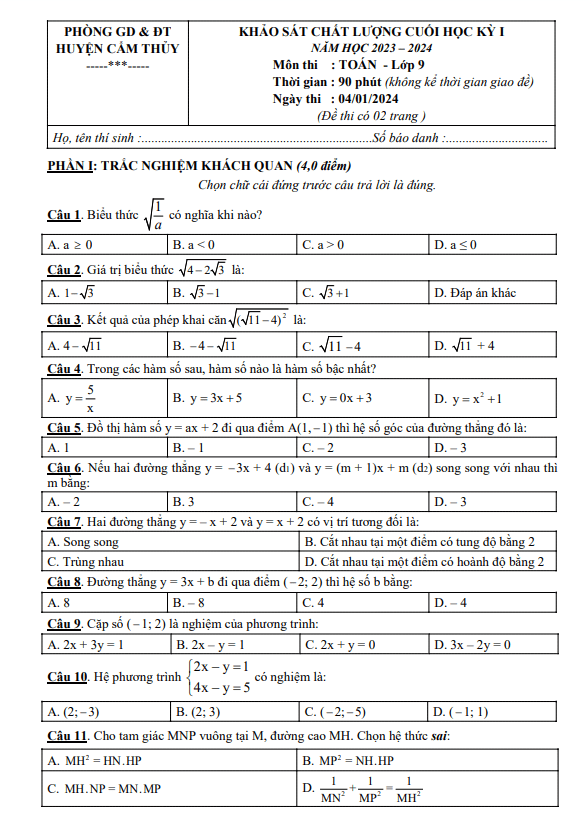 Đề Thi HK1 Toán 9 Đề cuối học kỳ 1 Toán 9 năm 2023 – 2024 phòng GD&ĐT Cẩm Thủy – Thanh Hóa 11/01/2024