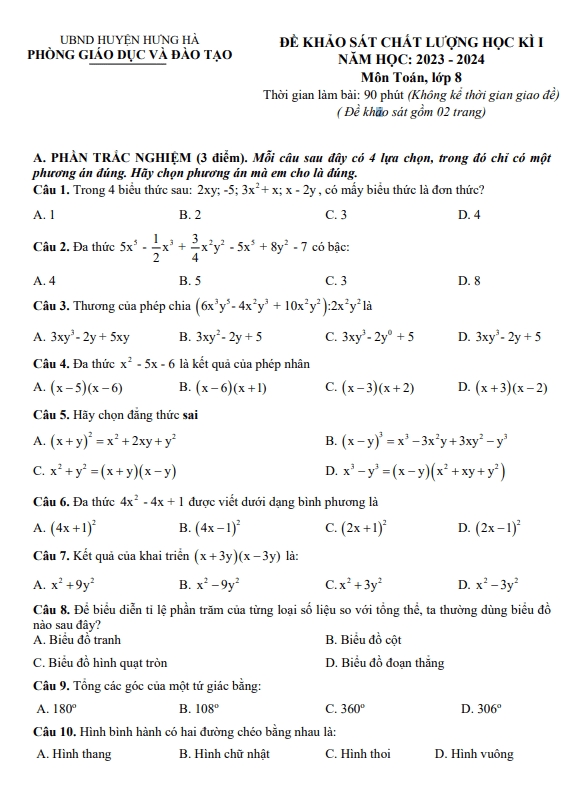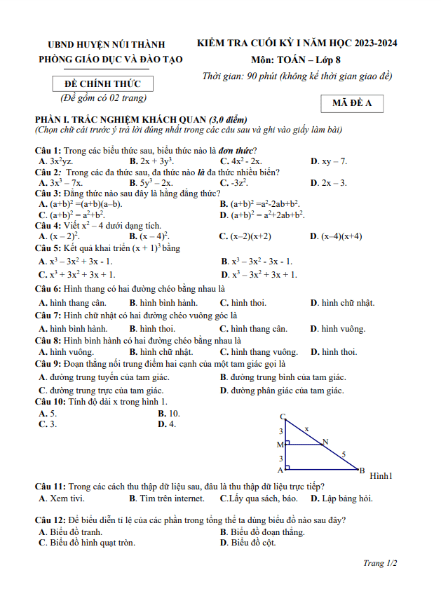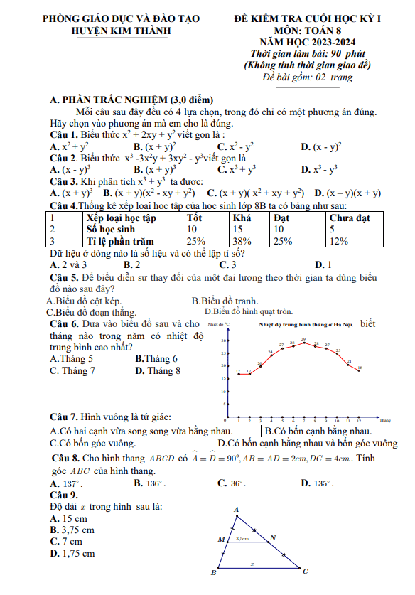 Đề Thi HK1 Toán 8 Đề cuối học kỳ 1 Toán 8 năm 2023 – 2024 phòng GD&ĐT Kim Thành – Hải Dương 08/01/2024
