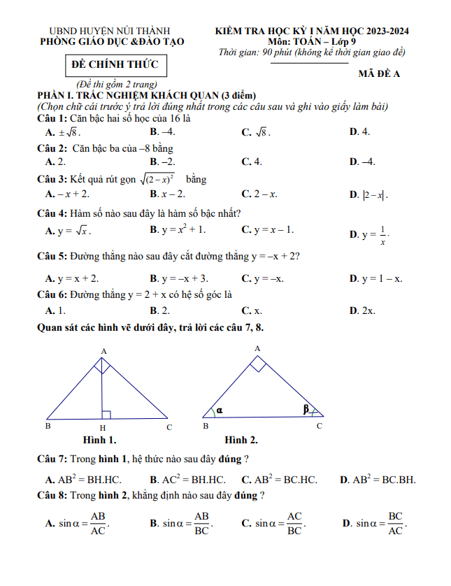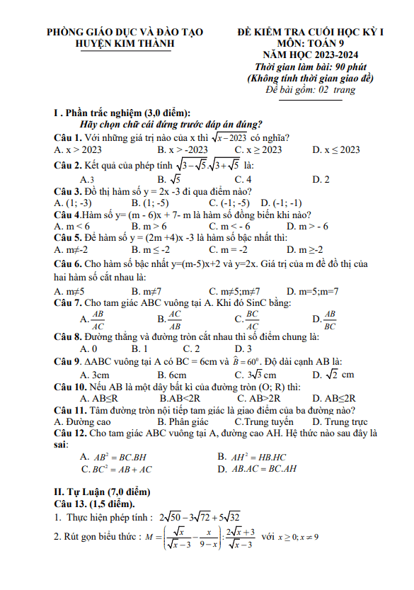 Đề Thi HK1 Toán 9 Đề cuối học kỳ 1 Toán 9 năm 2023 – 2024 phòng GD&ĐT Kim Thành – Hải Dương 08/01/2024