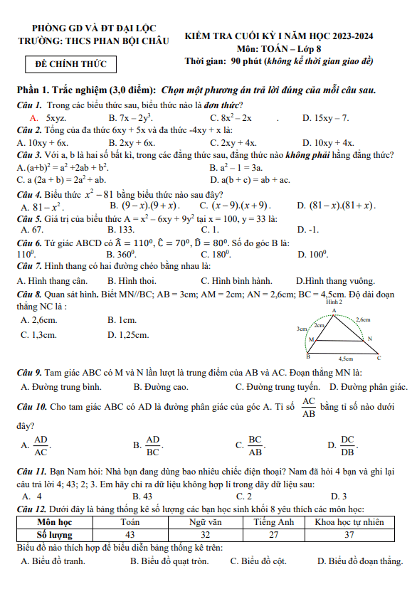 Đề Thi HK1 Toán 8 Đề cuối kỳ 1 Toán 8 năm 2023 – 2024 trường THCS Phan Bội Châu – Quảng Nam 08/01/2024