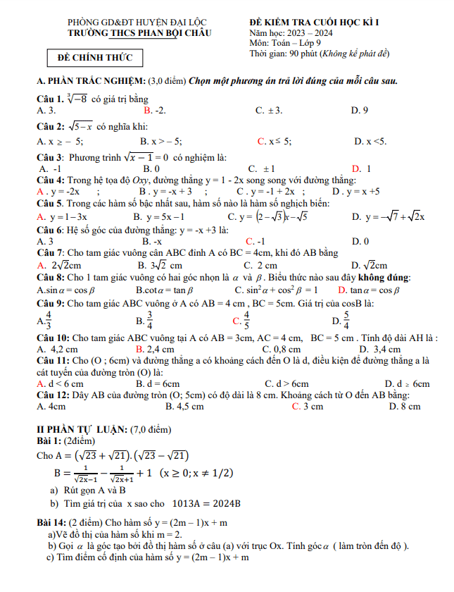Đề Thi HK1 Toán 9 Đề cuối kỳ 1 Toán 9 năm 2023 – 2024 trường THCS Phan Bội Châu – Quảng Nam 08/01/2024