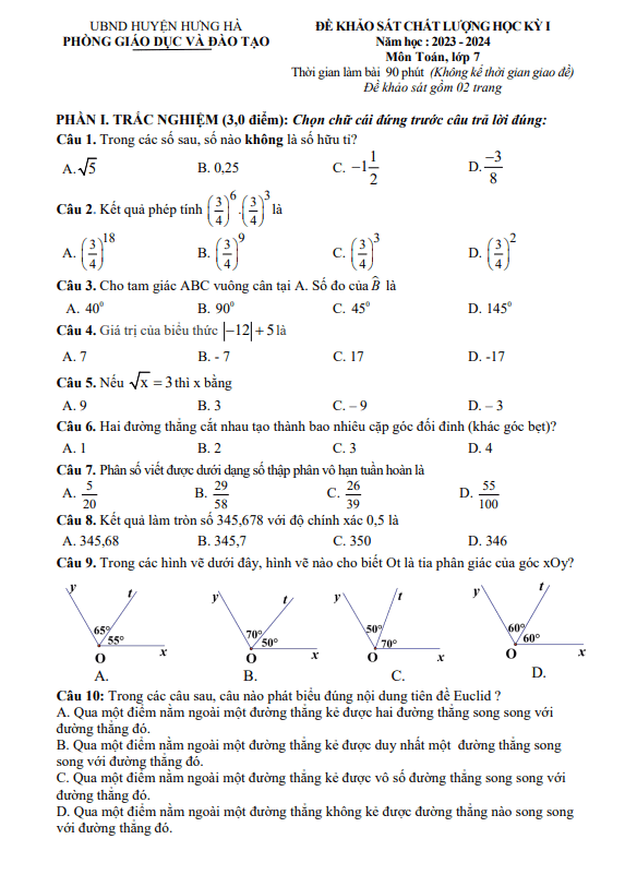 Đề Thi HK1 Toán 7 Đề cuối học kỳ 1 Toán 7 năm 2023 – 2024 phòng GD&ĐT Kim Thành – Hải Dương 08/01/2024