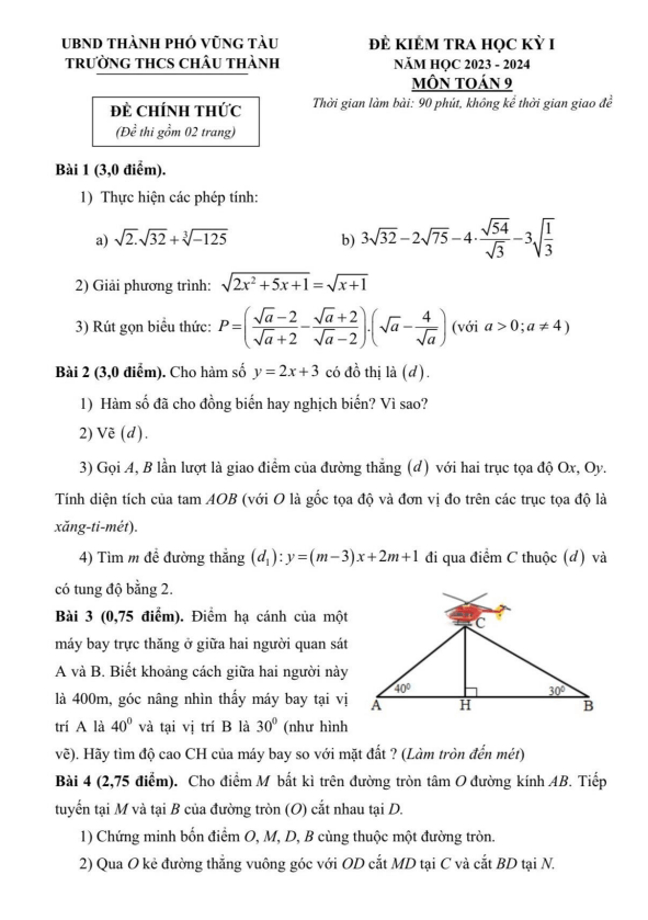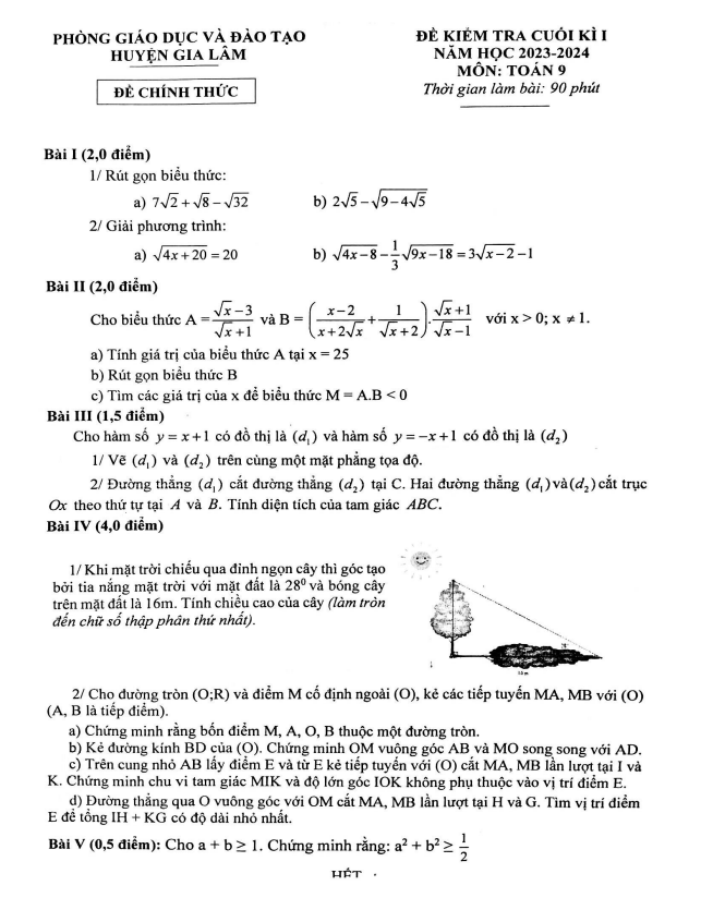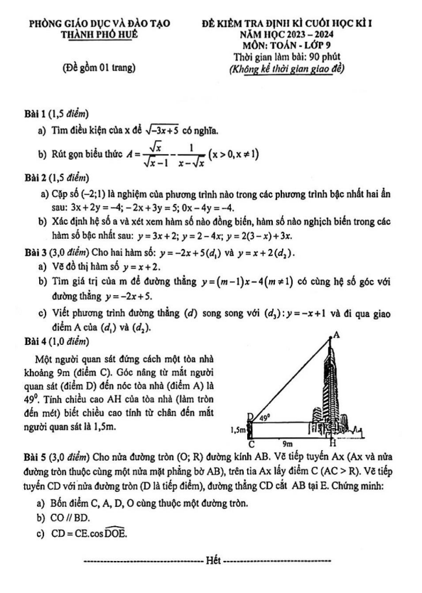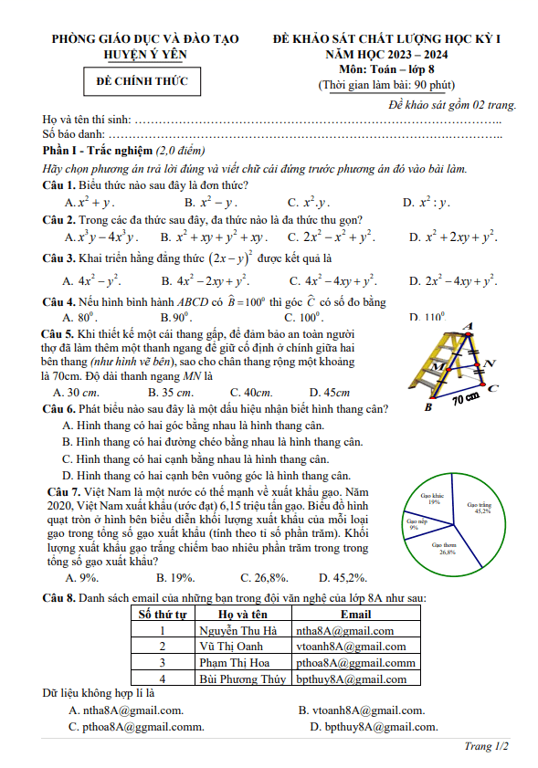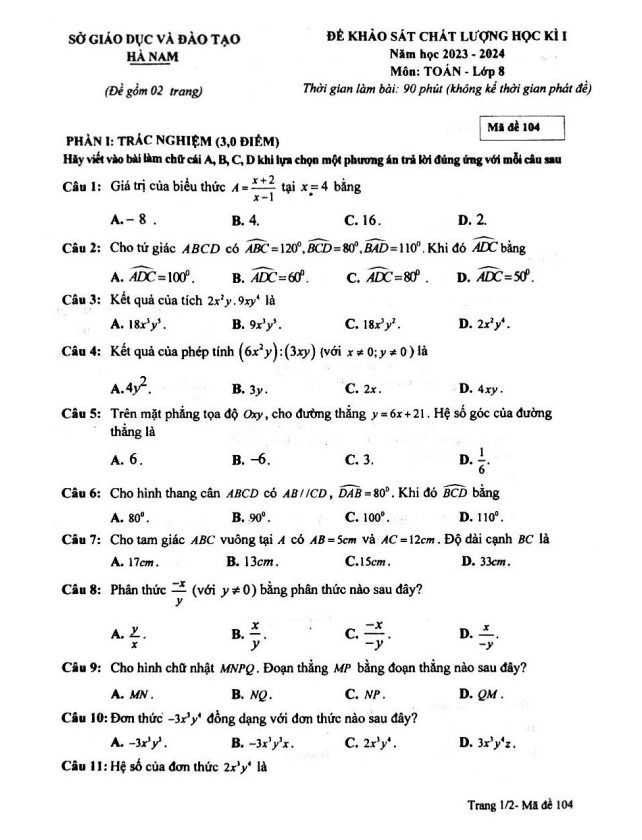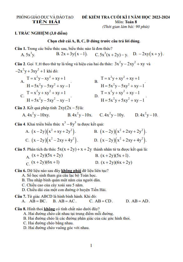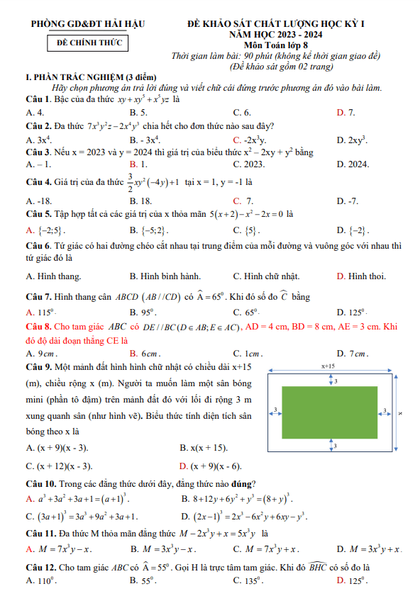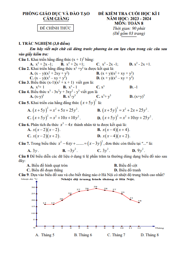 Đề Thi HK1 Toán 8 Đề cuối học kì 1 Toán 8 năm 2023 – 2024 phòng GD&ĐT Cẩm Giàng – Hải Dương 05/01/2024