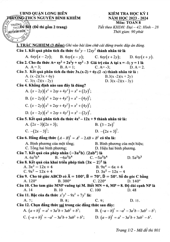 Đề Thi HK1 Toán 8 Đề cuối học kỳ 1 Toán 8 năm 2023 – 2024 trường THCS Nguyễn Bỉnh Khiêm – Hà Nội 08/01/2024
