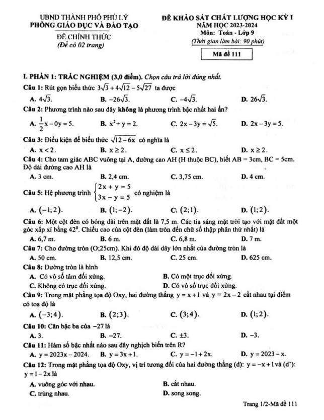Đề Thi HK1 Toán 7 Đề cuối học kì 1 Toán 7 năm 2023 – 2024 phòng GD&ĐT Cẩm Giàng – Hải Dương 05/01/2024