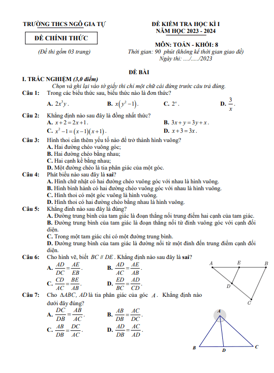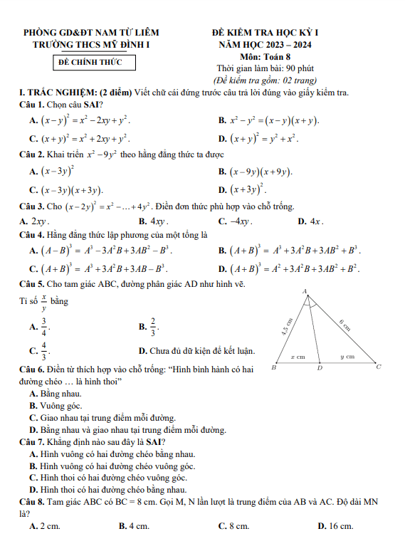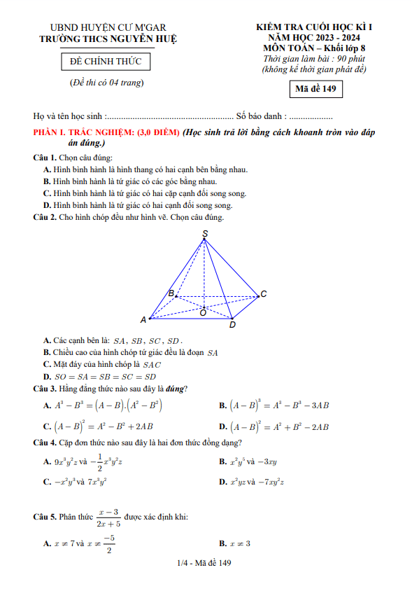Đề Thi HK1 Toán 8 Đề cuối học kì 1 Toán 8 năm 2023 – 2024 trường THCS Nguyễn Huệ – Đắk Lắk 04/01/2024
