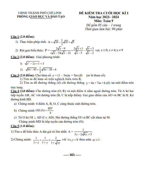 Đề Thi HK1 Toán 9 Đề cuối học kì 1 Toán 9 năm 2023 – 2024 phòng GD&ĐT Chí Linh – Hải Dương 04/01/2024