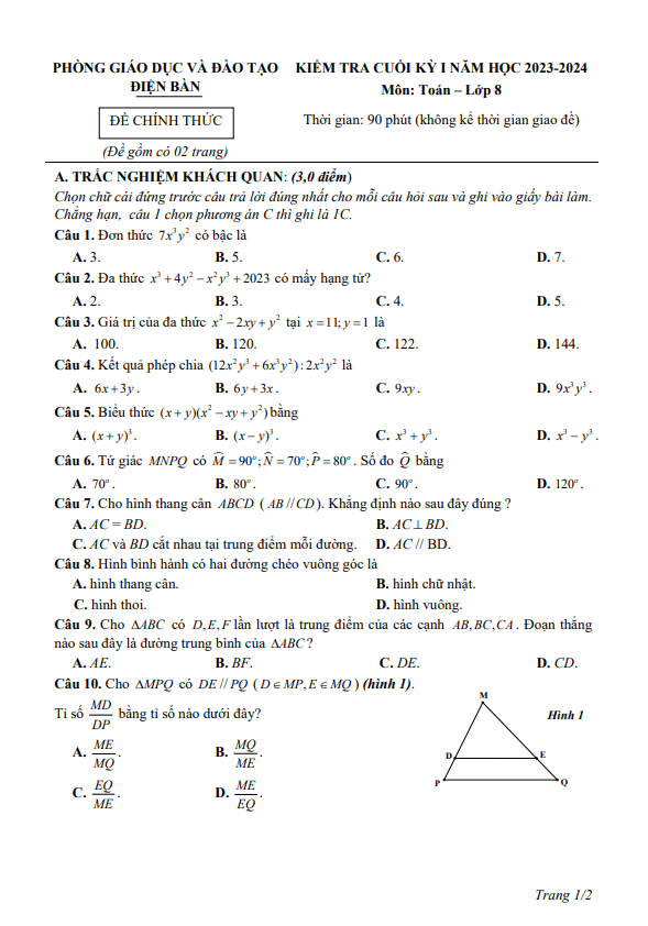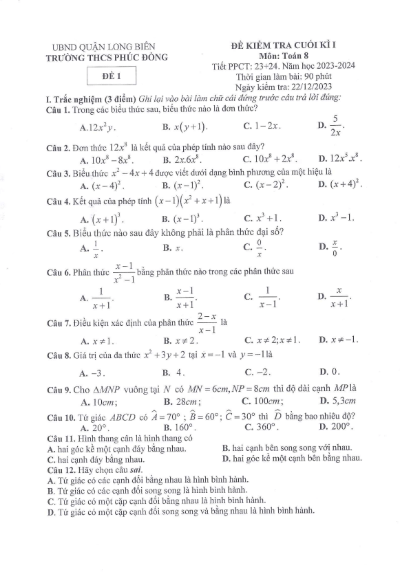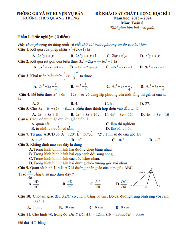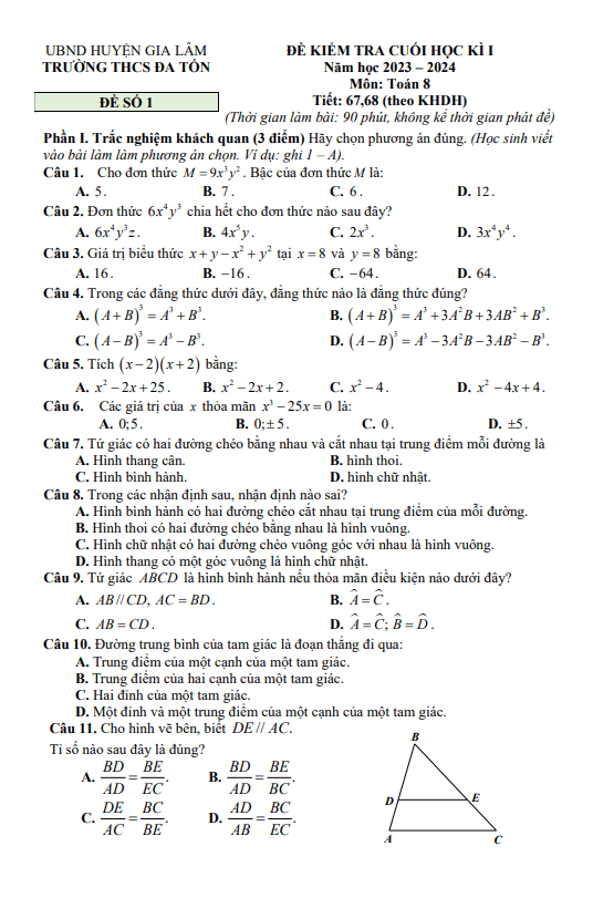 Đề Thi HK1 Toán 8 Đề cuối học kì 1 Toán 8 năm 2023 – 2024 phòng GD&ĐT Chí Linh – Hải Dương 04/01/2024