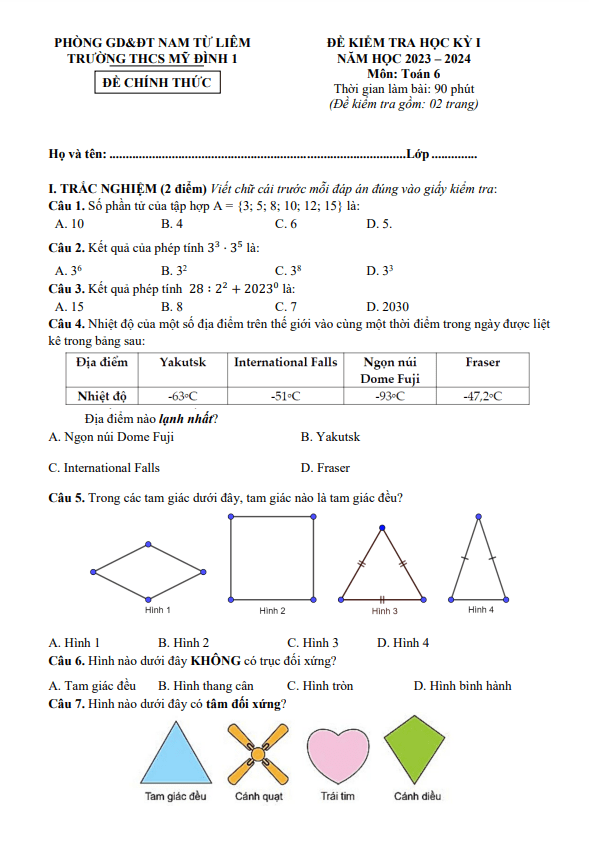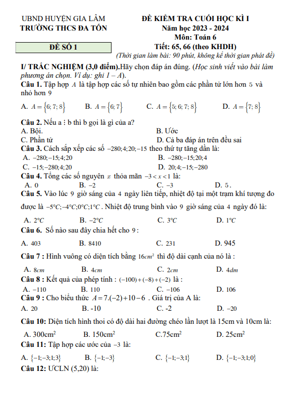Đề Thi HK1 Toán 6 Đề cuối học kì 1 Toán 6 năm 2023 – 2024 trường THCS Nguyễn Huệ – Đắk Lắk 04/01/2024