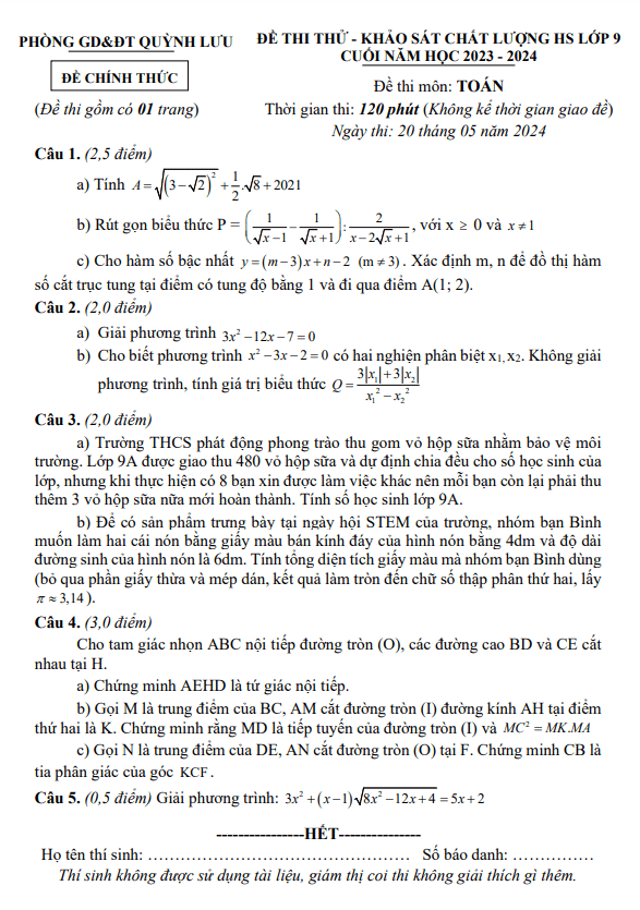 Khảo Sát Chất Lượng Toán 9 Đề khảo sát Toán 9 cuối năm 2023 – 2024 phòng GD&ĐT Quỳnh Lưu – Nghệ An 22/05/2024