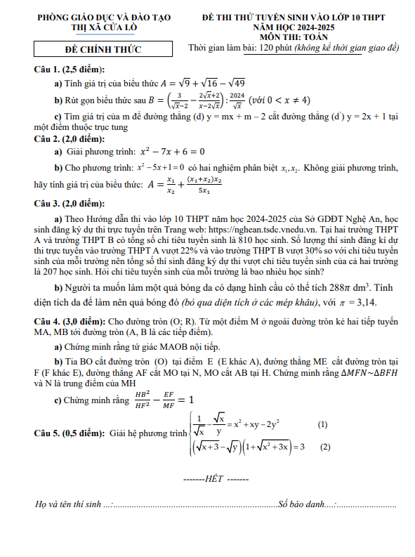 Đề Thi Tuyển Sinh Lớp 10 Môn Toán Đề thi thử Toán tuyển sinh lớp 10 năm 2024 – 2025 phòng GD&ĐT Cửa Lò – Nghệ An 22/05/2024