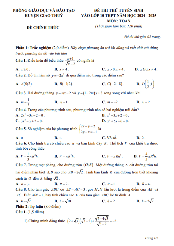 Đề Thi Tuyển Sinh Lớp 10 Môn Toán Đề thi thử Toán tuyển sinh lớp 10 năm 2024 – 2025 phòng GD&ĐT Giao Thủy – Nam Định 23/05/2024