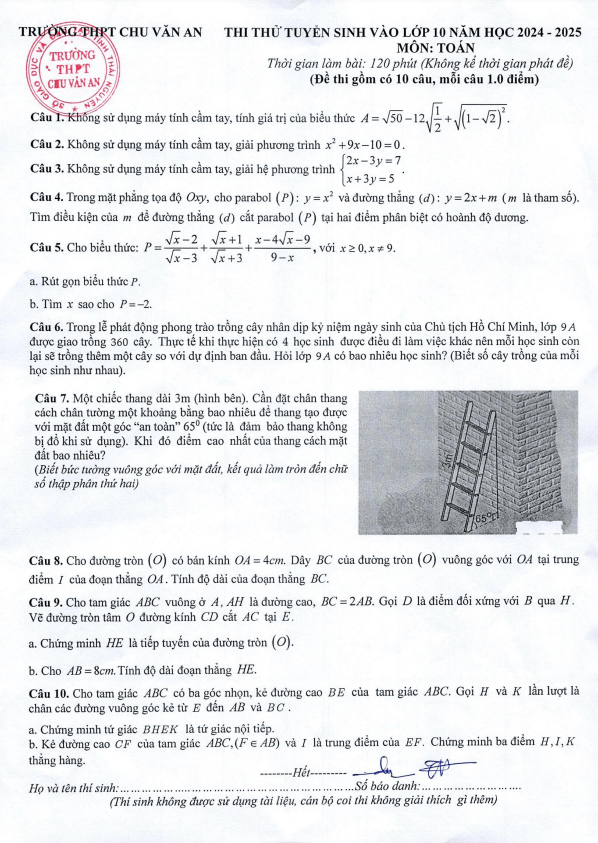Đề Thi Tuyển Sinh Lớp 10 Môn Toán Đề thi thử Toán tuyển sinh lớp 10 năm 2024 – 2025 trường THPT Chu Văn An – Thái Nguyên 22/05/2024