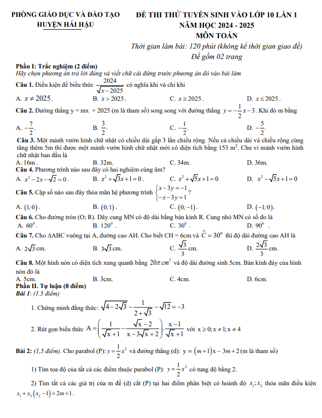 Đề Thi Tuyển Sinh Lớp 10 Môn Toán Đề thi thử Toán vào lớp 10 lần 1 năm 2024 – 2025 phòng GD&ĐT Hải Hậu – Nam Định 23/05/2024