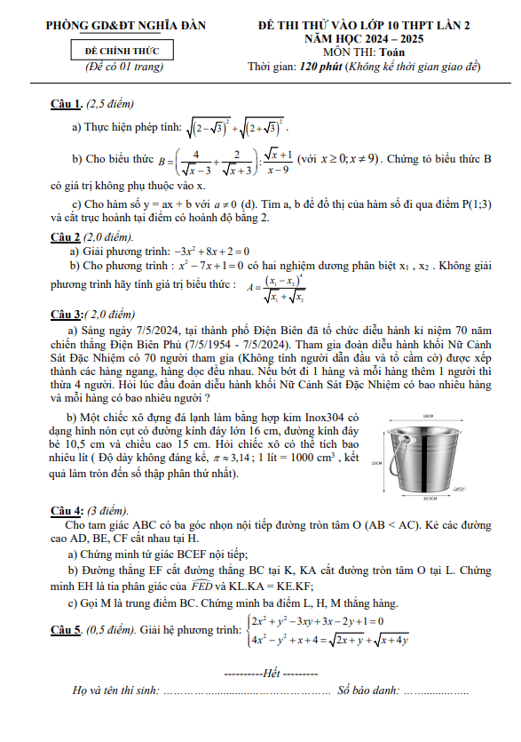 Đề Thi Tuyển Sinh Lớp 10 Môn Toán Đề thi thử Toán vào lớp 10 lần 2 năm 2024 – 2025 phòng GD&ĐT Nghĩa Đàn – Nghệ An 22/05/2024