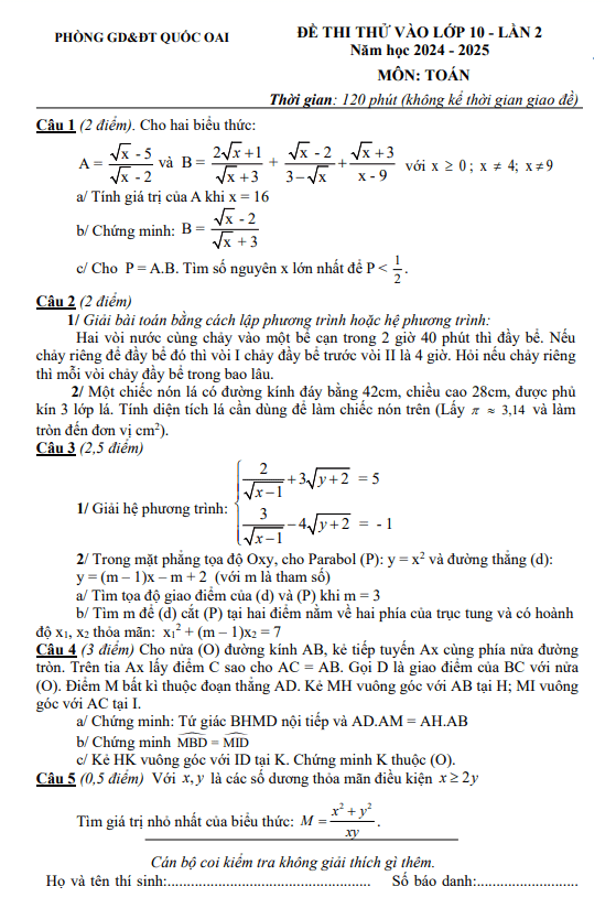 Đề Thi Tuyển Sinh Lớp 10 Môn Toán Đề thi thử Toán vào lớp 10 lần 2 năm 2024 – 2025 phòng GD&ĐT Quốc Oai – Hà Nội 23/05/2024