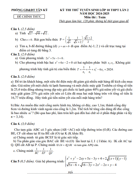 Đề Thi Tuyển Sinh Lớp 10 Môn Toán Đề thi thử Toán vào lớp 10 lần 2 năm 2024 – 2025 phòng GD&ĐT Tân Kỳ – Nghệ An 22/05/2024