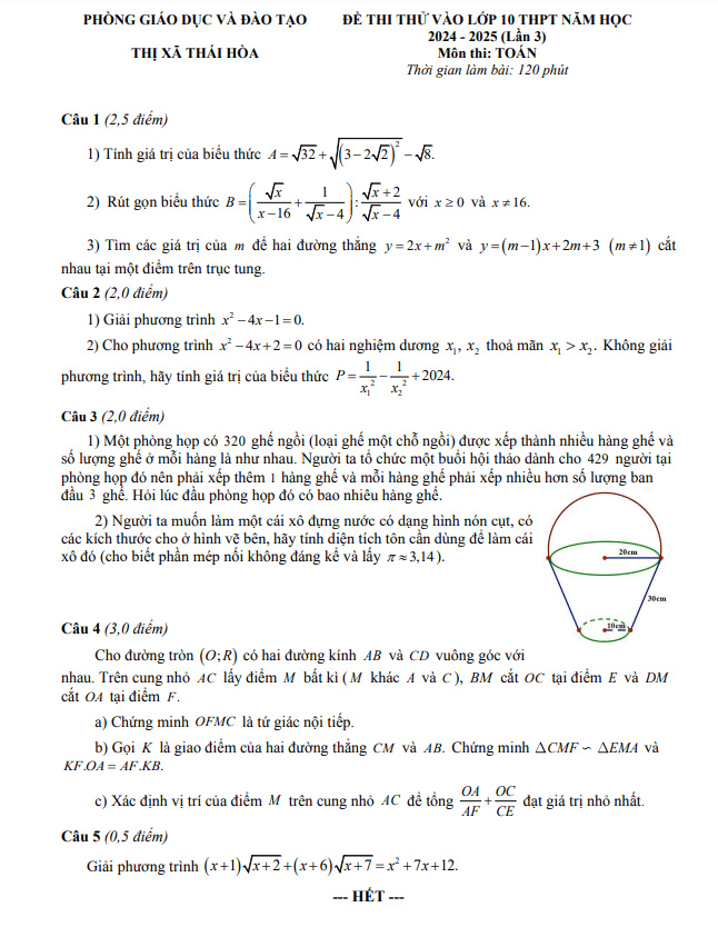 Đề Thi Tuyển Sinh Lớp 10 Môn Toán Đề thi thử Toán vào lớp 10 lần 3 năm 2024 – 2025 phòng GD&ĐT Thái Hòa – Nghệ An 22/05/2024