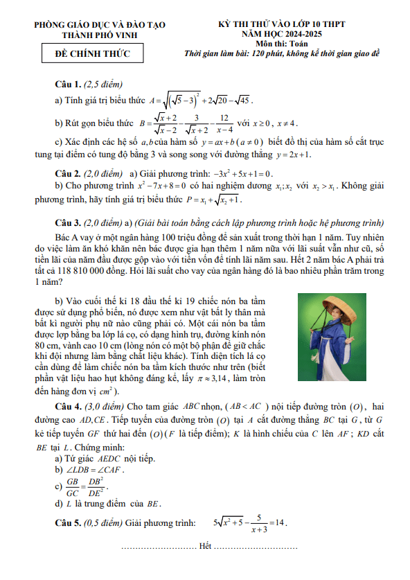 Đề Thi Tuyển Sinh Lớp 10 Môn Toán Đề thi thử Toán vào lớp 10 năm 2024 – 2025 phòng GD&ĐT Vinh – Nghệ An 23/05/2024