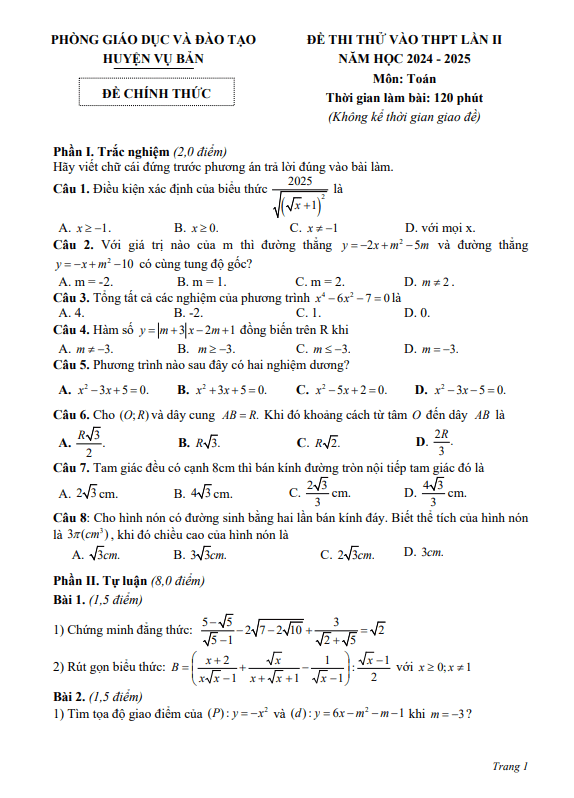 Đề Thi Tuyển Sinh Lớp 10 Môn Toán Đề thi thử Toán vào THPT lần 2 năm 2024 – 2025 phòng GD&ĐT Vụ Bản – Nam Định 22/05/2024