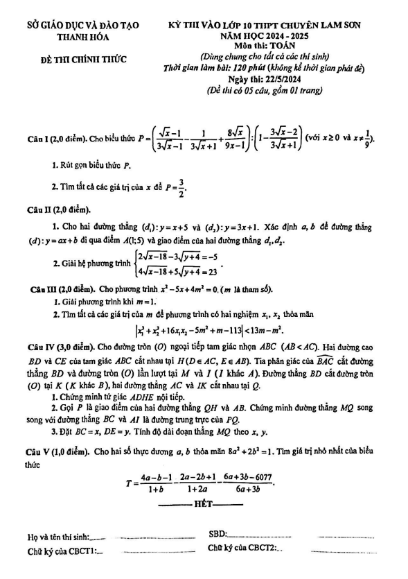 Đề Thi Tuyển Sinh Lớp 10 Môn Toán Đề thi vào lớp 10 môn Toán năm 2024 – 2025 trường chuyên Lam Sơn – Thanh Hóa 23/05/2024