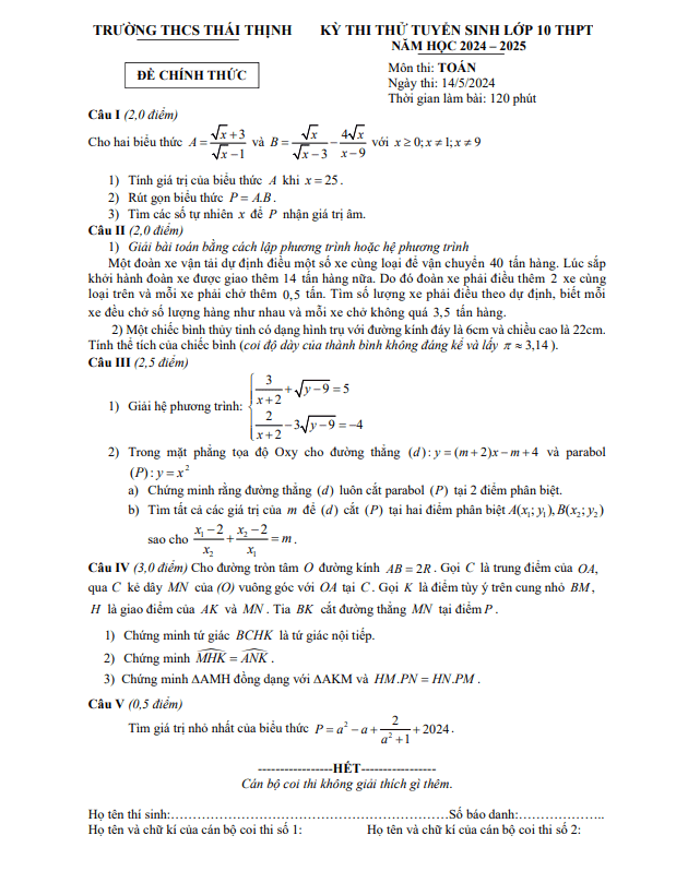 Đề Thi Tuyển Sinh Lớp 10 Môn Toán Đề thi thử Toán tuyển sinh lớp 10 năm 2024 – 2025 trường THCS Thái Thịnh – Hà Nội 15/05/2024