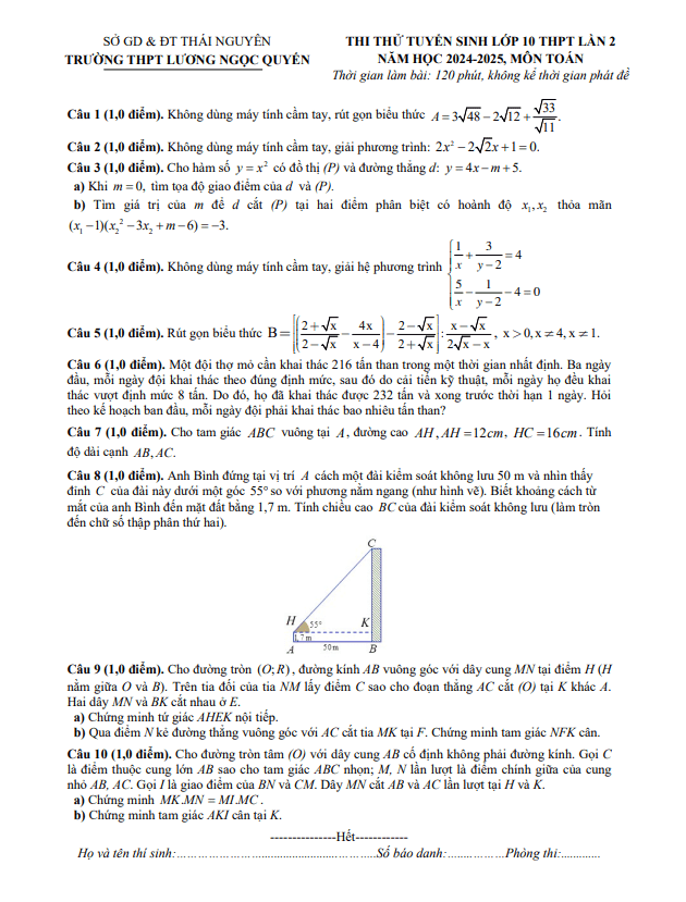Đề Thi Tuyển Sinh Lớp 10 Môn Toán Đề thi thử Toán vào 10 lần 2 năm 2024 – 2025 trường Lương Ngọc Quyến – Thái Nguyên 15/05/2024