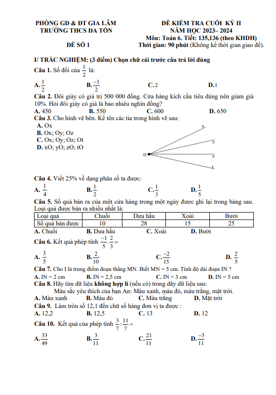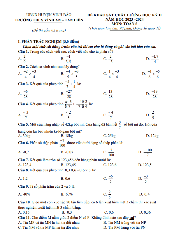 Đề Thi HK2 Toán 6 Đề học kỳ 2 Toán 6 năm 2023 – 2024 trường THCS Vĩnh An – Tân Liên – Hải Phòng 04/05/2024