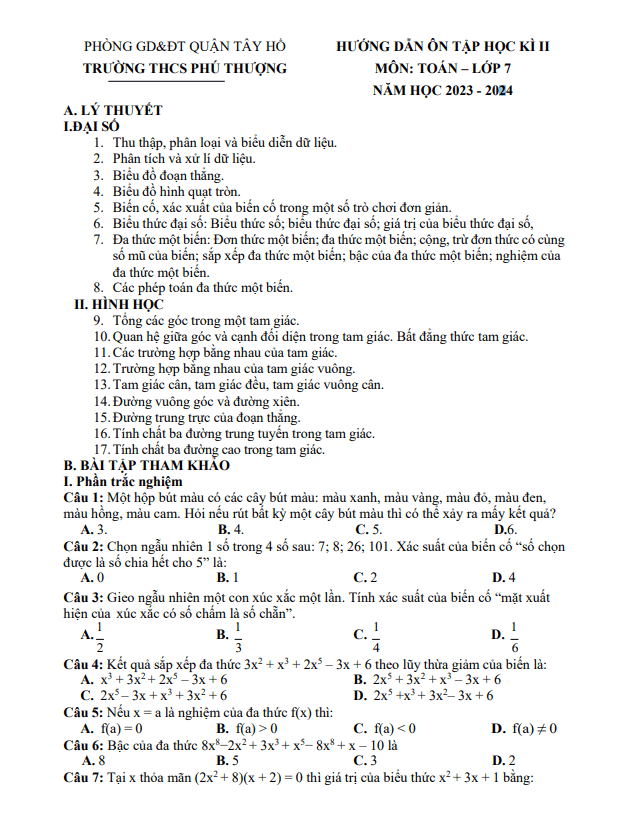 Đề Cương Ôn Tập Toán 7 Đề cương học kì 2 Toán 7 năm 2023 – 2024 trường THCS Phú Thượng – Hà Nội 02/05/2024