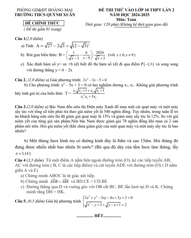 Đề Thi Tuyển Sinh Lớp 10 Môn Toán Đề thi thử Toán vào 10 lần 2 năm 2024 – 2025 trường THCS Quỳnh Xuân – Nghệ An 02/05/2024