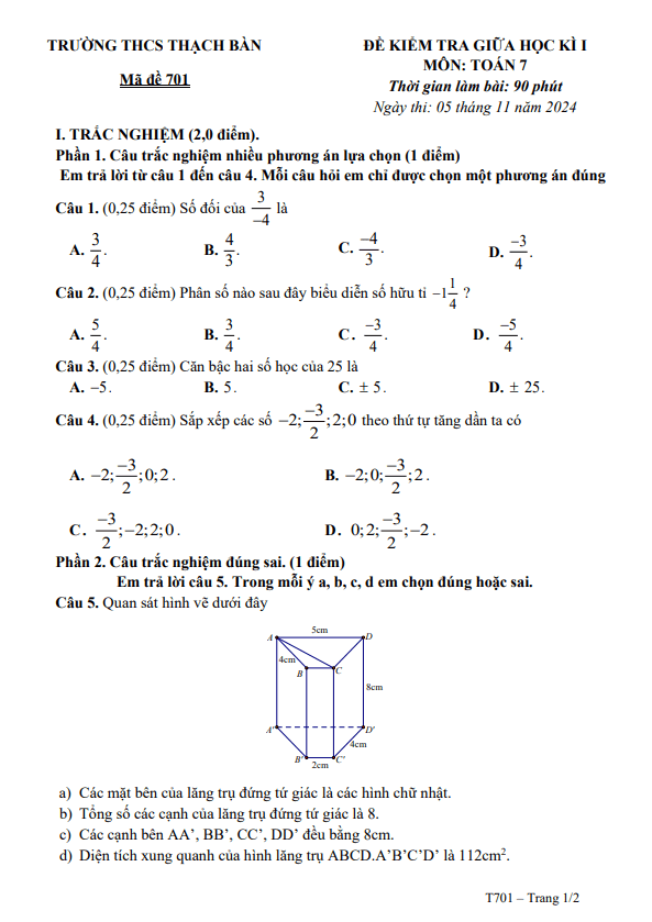 THCS.TOANMATH.com giới thiệu đến quý thầy, cô giáo và các em học sinh lớp 7 đề kiểm tra giữa học kỳ 1 môn Toán 7 năm học 2024 – 2025 trường THCS Đông Hưng B, tỉnh Kiên Giang. Đề thi có đáp án chi tiết và hướng dẫn chấm điểm.