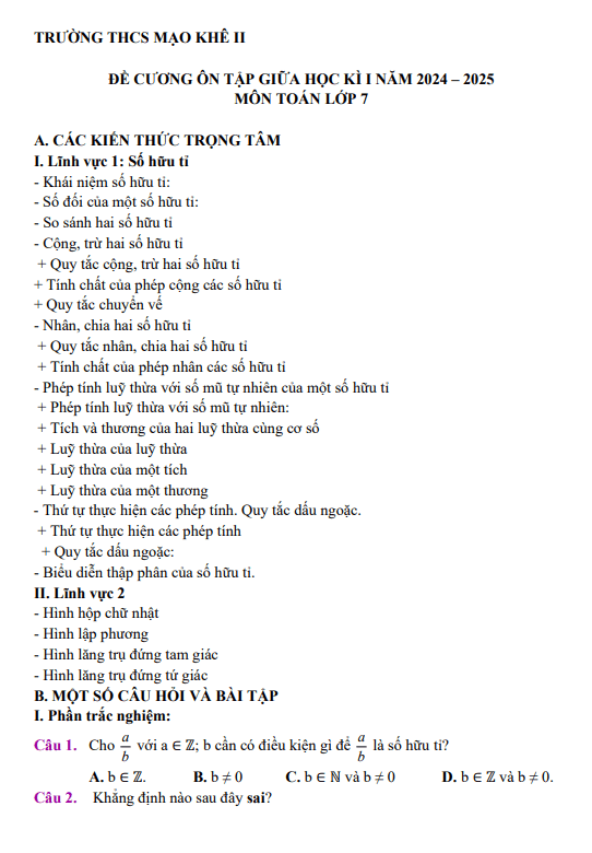 Đề Cương Ôn Tập Toán 7 Đề cương giữa học kì 1 Toán 7 năm 2024 – 2025 trường THCS Mạo Khê 2 – Quảng Ninh 22/10/2024