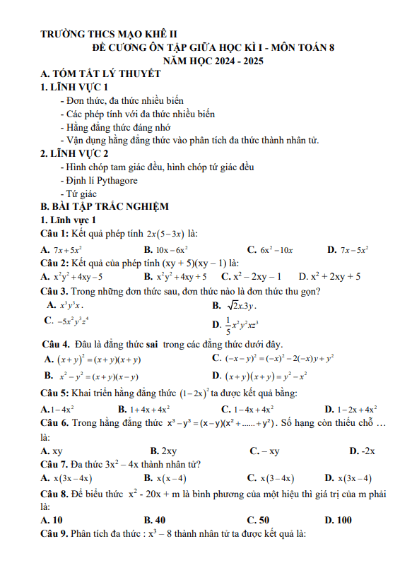 Đề Cương Ôn Tập Toán 8 Đề cương giữa học kì 1 Toán 8 năm 2024 – 2025 trường THCS Mạo Khê 2 – Quảng Ninh 22/10/2024