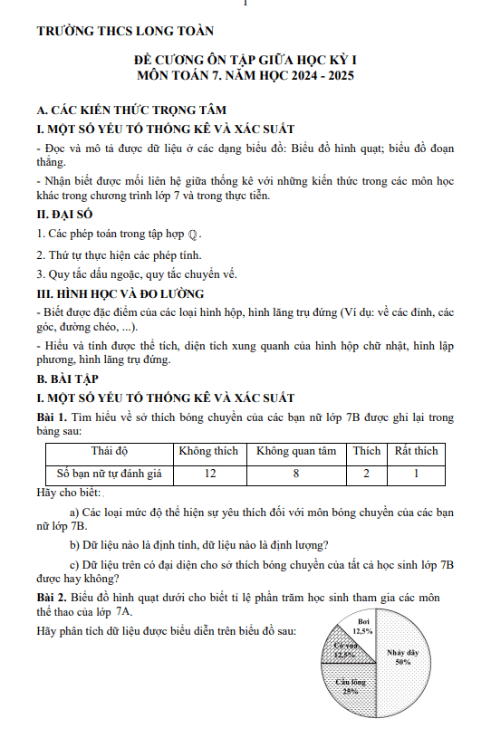 Đề Cương Ôn Tập Toán 7 Đề cương giữa học kì 1 Toán 7 năm 2024 – 2025 trường THCS Long Toàn – BR VT 19/10/2024