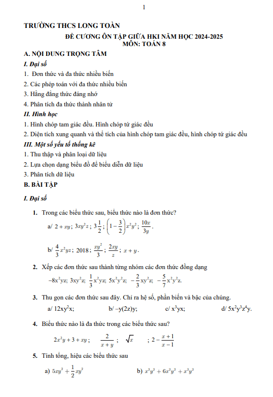 Đề Cương Ôn Tập Toán 8 Đề cương giữa học kì 1 Toán 8 năm 2024 – 2025 trường THCS Long Toàn – BR VT 19/10/2024