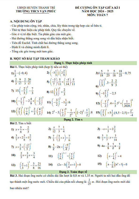 Đề Cương Ôn Tập Toán 7 Đề cương giữa kì 1 Toán 7 năm 2024 – 2025 trường THCS Vạn Phúc – Hà Nội 19/10/2024