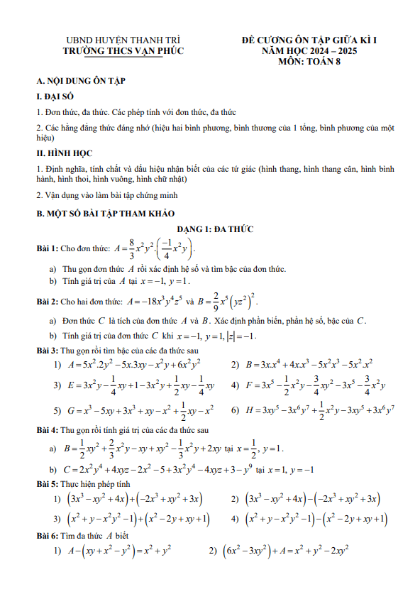 Đề Cương Ôn Tập Toán 8 Đề cương giữa kì 1 Toán 8 năm 2024 – 2025 trường THCS Vạn Phúc – Hà Nội 19/10/2024