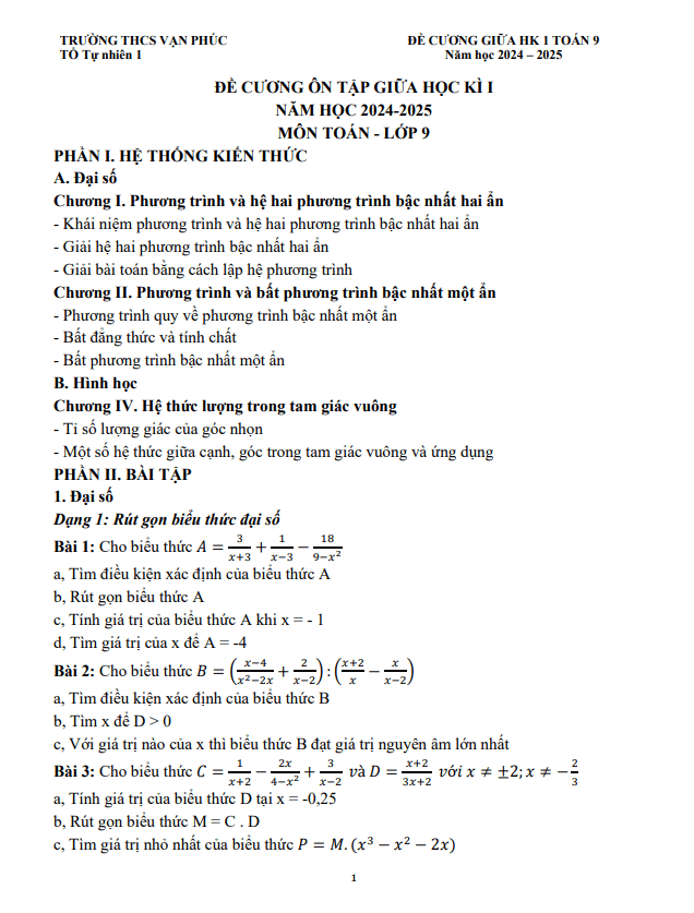 Đề Cương Ôn Tập Toán 9 Đề cương giữa kì 1 Toán 9 năm 2024 – 2025 trường THCS Vạn Phúc – Hà Nội 19/10/2024