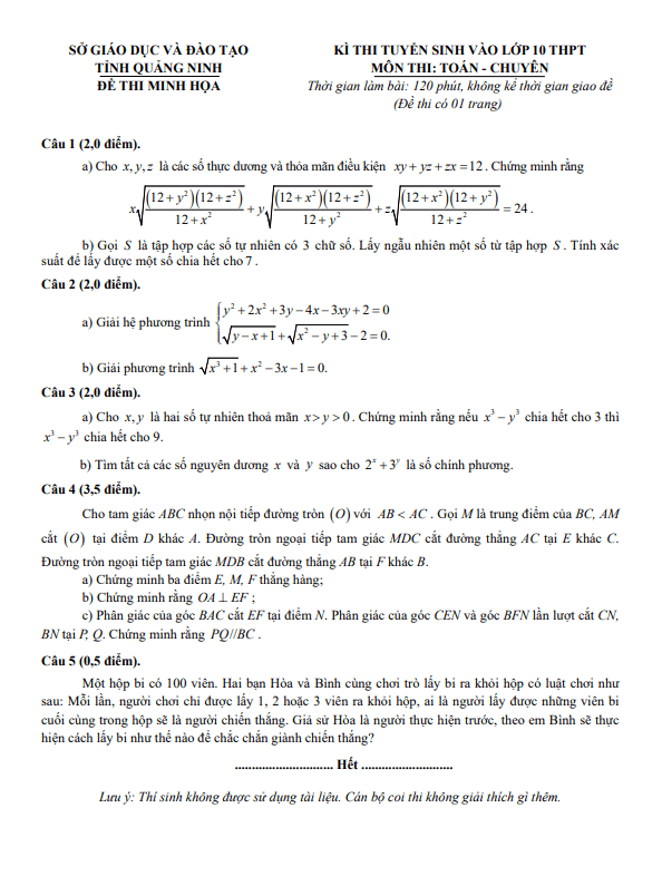 Đề Thi Tuyển Sinh Lớp 10 Môn Toán Đề minh họa tuyển sinh lớp 10 môn Toán (chuyên) năm 2025 – 2026 sở GD&ĐT Quảng Ninh 20/10/2024