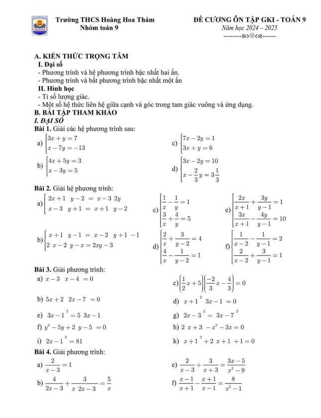 Đề Cương Ôn Tập Toán 9 Đề cương ôn tập GK1 Toán 9 năm 2024 – 2025 trường THCS Hoàng Hoa Thám – Hà Nội 11/10/2024